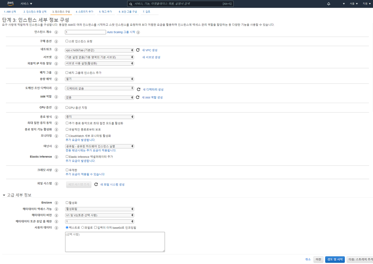 EC2 선택 > 인스턴트 > 인스턴트 생성