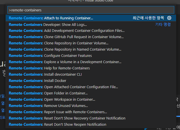 1. 메뉴 > 보기 > 명령 팔레트(Show Command Palette) > remote-containers: Attach to Running Container... 검색 및 선택
