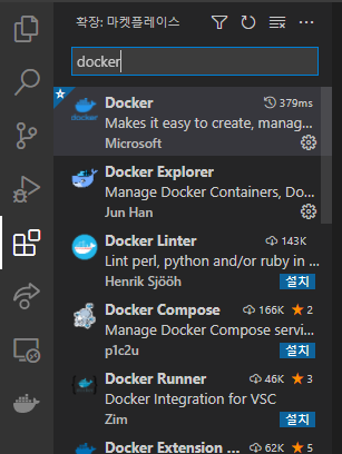 vscode의 extension을 추가로 설치하여 좀 더 편하게 도커 환경을 확인할 수 있다.