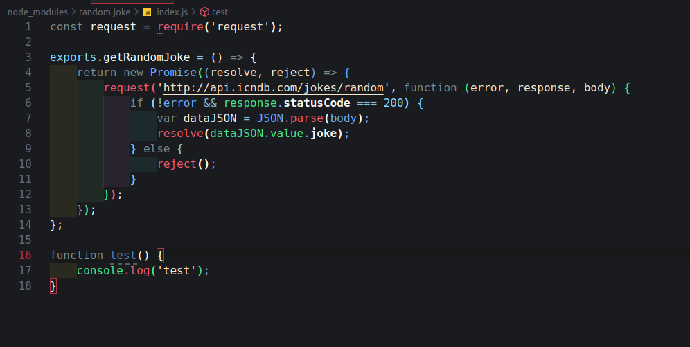 진짜 별 거 없네요. getRandomJoke라는 놈만을 export 하고 있는데, Promise를 리턴하는 익명함수입니다.