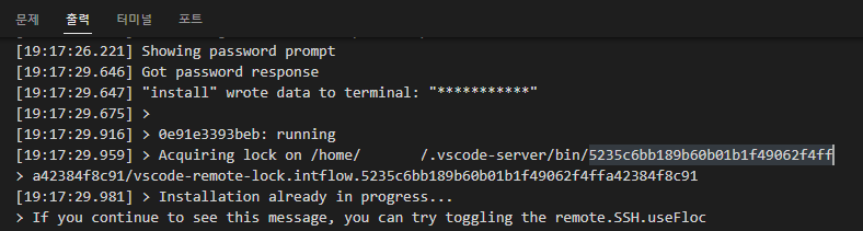 처음 접속할 경우 서버쪽에 vscode 관련 프로그램?을 다운로드 받는데