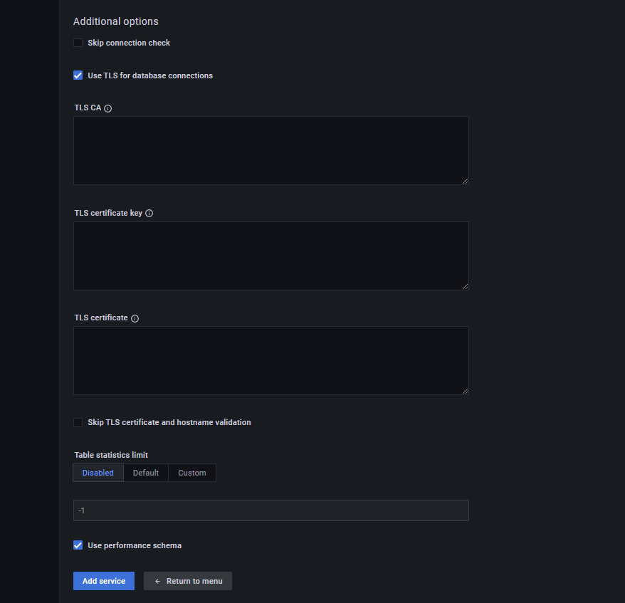 MySQL 인스턴스가 TLS를 사용하도록 구성된 경우 데이터베이스 연결에 TLS 사용 확인란을 클릭하고 TLS 인증서와 키를 입력합니다.