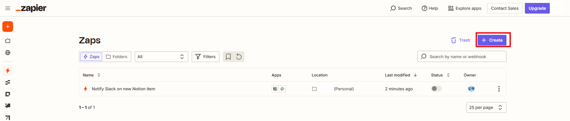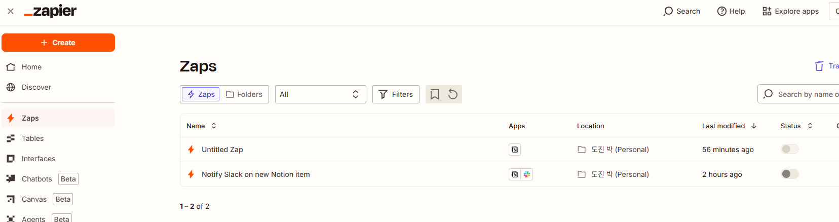 혹시라도 알림이 안오는 경우 home > zaps 에서 status 가 on 인지 확인하고,